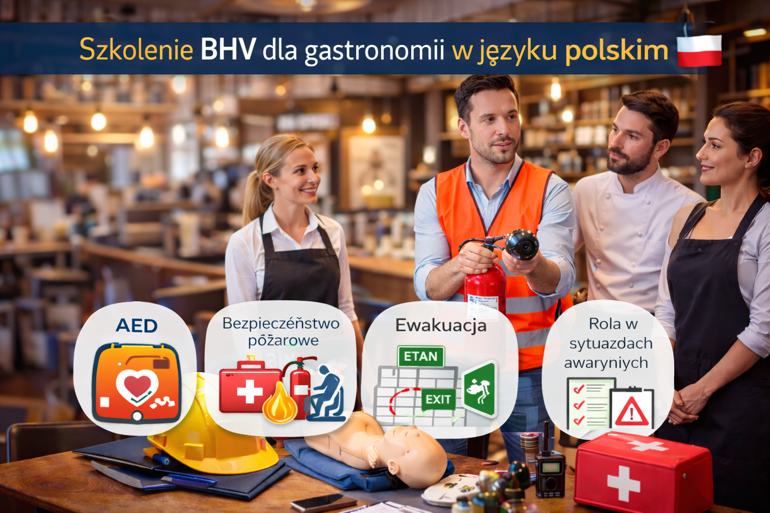 Coraz częściej zarówno pracownicy, jak i goście w branży gastronomicznej posługują się językiem polskim. Aby odpowiedzieć na tę potrzebę, oferujemy szkolenie BHV dla gastronomii w całości prowadzone w języku polskim. Kurs ten został specjalnie opracowany dla zespołów, dla których język polski jest językiem roboczym, dzięki czemu są oni dobrze przygotowani do reagowania w sytuacjach awaryjnych.